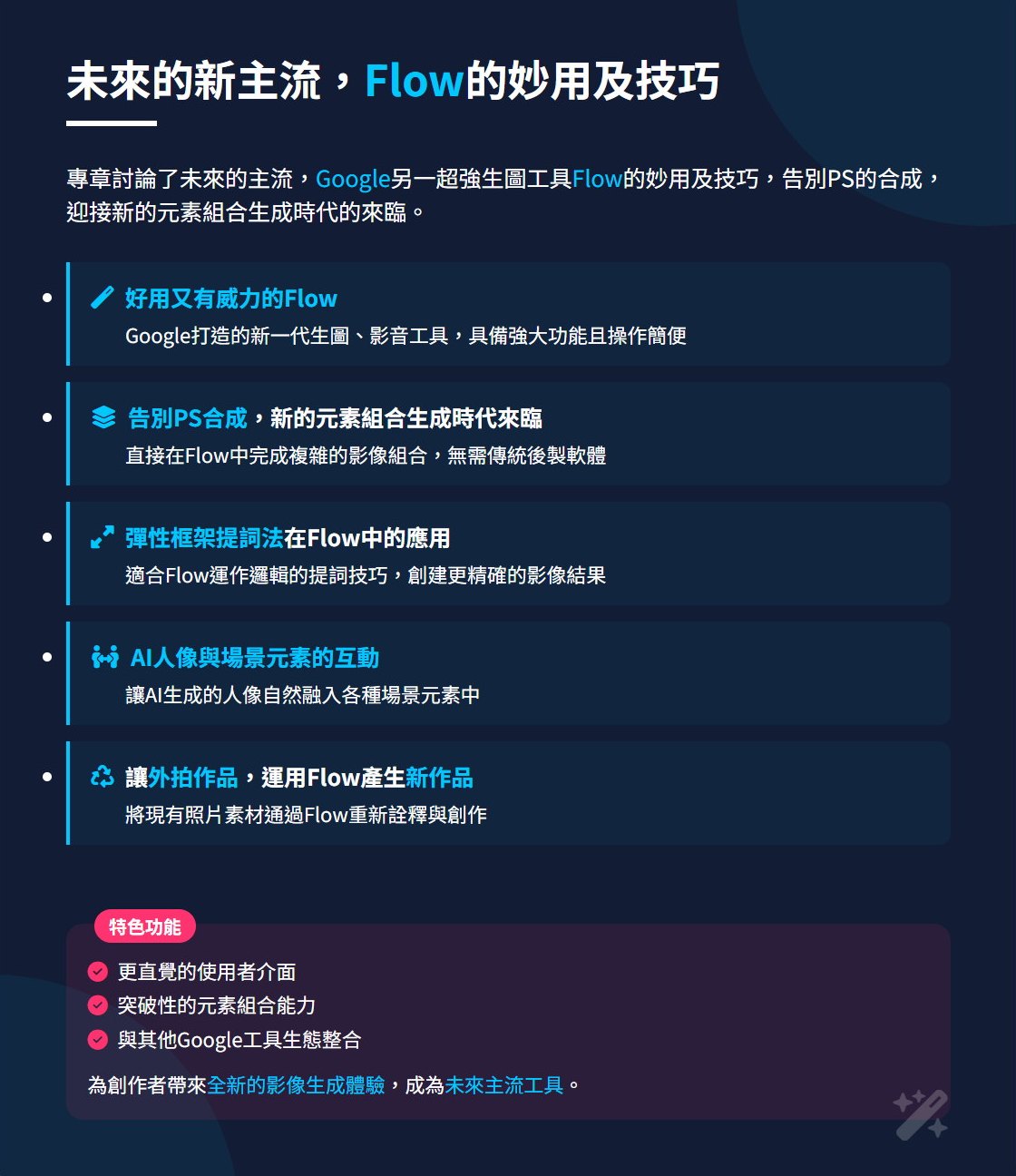 放眼未來,最後以專章討論了未來的主流,Google另一超強生圖工具Whisk的妙用及技巧,告別PS的合成,迎接新的元素組合生成時代的來臨。