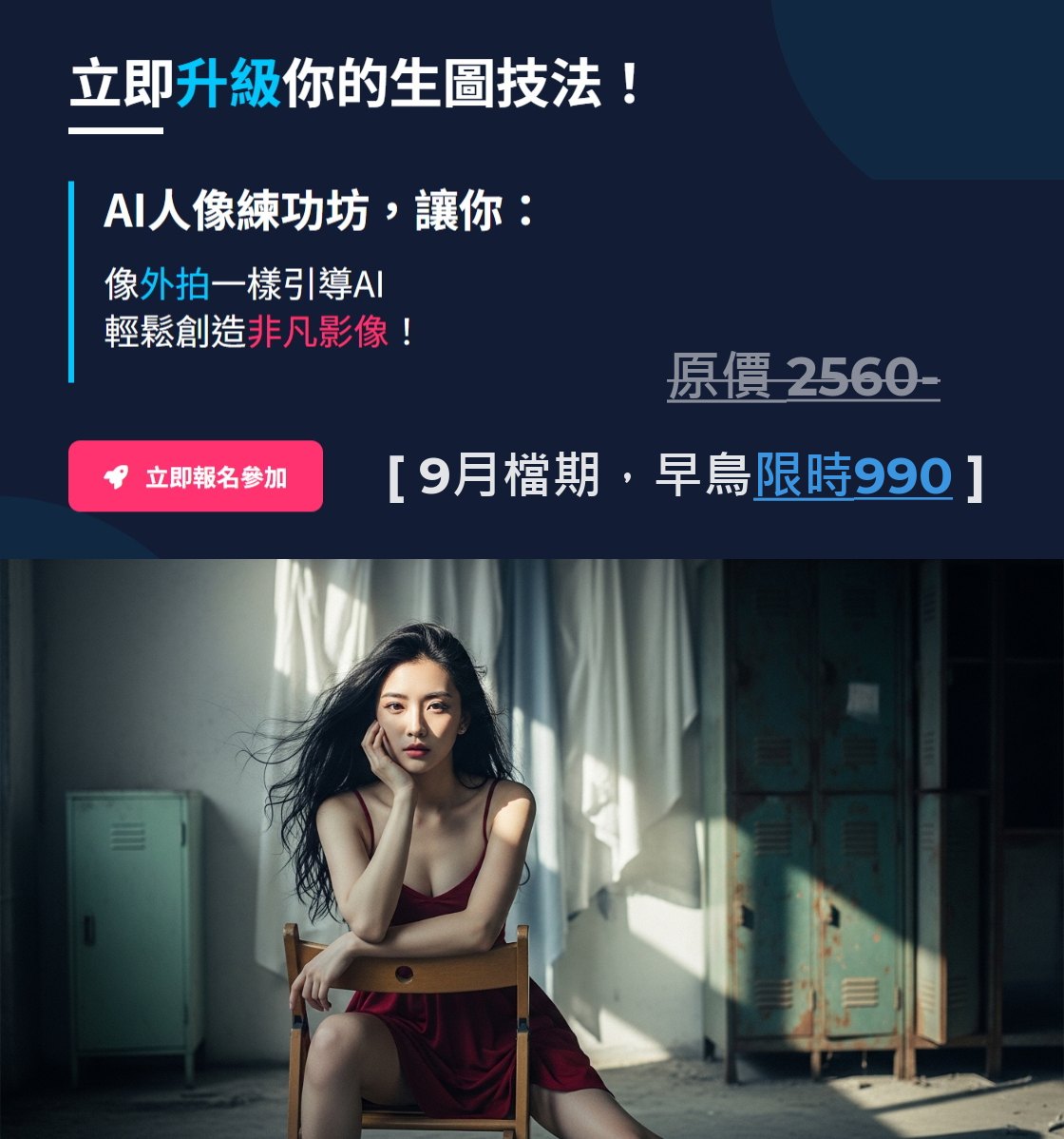 不管你是AI人像的愛好者、初學者、攝影人,都可以盡情享受這個新課,像外拍一樣引導AI,輕鬆創造非凡影像!